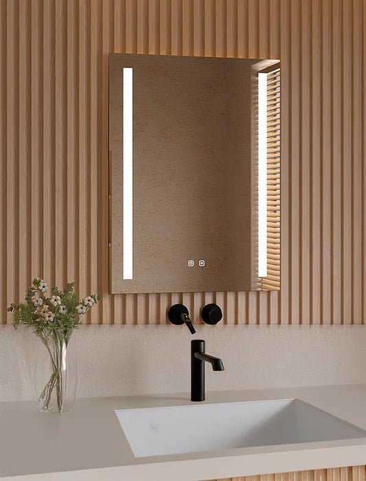 El espejo LED Myanmar está fabricado con luna de 5 mm copper free y lámina de seguridad anti explosión, ofreciendo una superficie resistente, segura y preparada para el uso diario en entornos húmedos. Incorpora una tira LED enmarcada con cambio de temperatura de luz (2700–6500 K) y regulación de intensidad, controladas mediante sensores táctiles independientes para encendido y ajuste lumínico. Incluye sistema antivaho con sensor propio, que mantiene el espejo siempre despejado incluso con vapor, y cuenta además con 2 puertos USB de carga laterales para dispositivos personales. Sus LEDs y componentes electrónicos con protección IP67/IP44 garantizan un funcionamiento óptimo frente al agua y la humedad. Se completa con caja de registro ignífuga, ficha de conexión incluida y un embalaje extrarreforzado antiroturas, válido para transporte unitario, asegurando una instalación segura y una durabilidad prolongada.